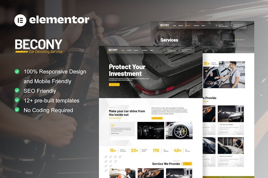 Becony is elementor template kit for Car Detailing Service & Car Repair website. It has 12 pre-built templates with modern design & clean style. This template kit ready to use for business and services related car detailing services such as car painting, car modification, car body repair, car mechanic, car maintenance, car mechanic, car detailing, car garage, car inspections. Save your time to make Car Detailing Service & Car Repair Website with this elementor template kit. With Elementor Page Builder, you can easily edit or customize it, no coding required, just drag and drop.