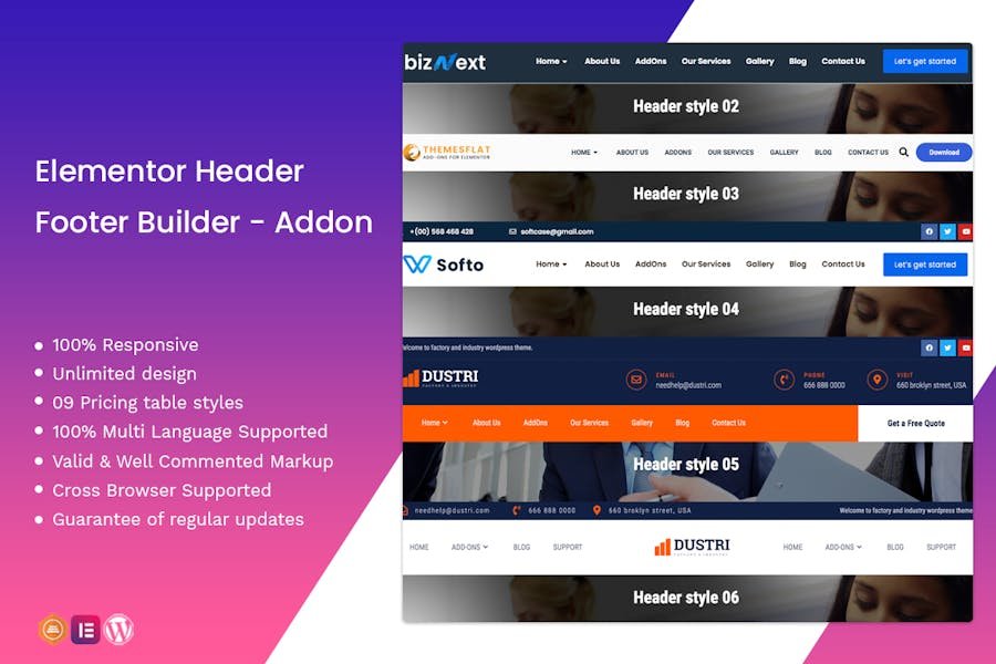 Elementor Header Footer Builder – Addon Elementor Header Using create out of the box header and footer designs. It display on the entire website? Use it to create header, footer for any design. We built 08 stlye header in the live demo and attach json file package. After buying you just need to download and import into Elementor page template you will get Header, Footer like demo.
