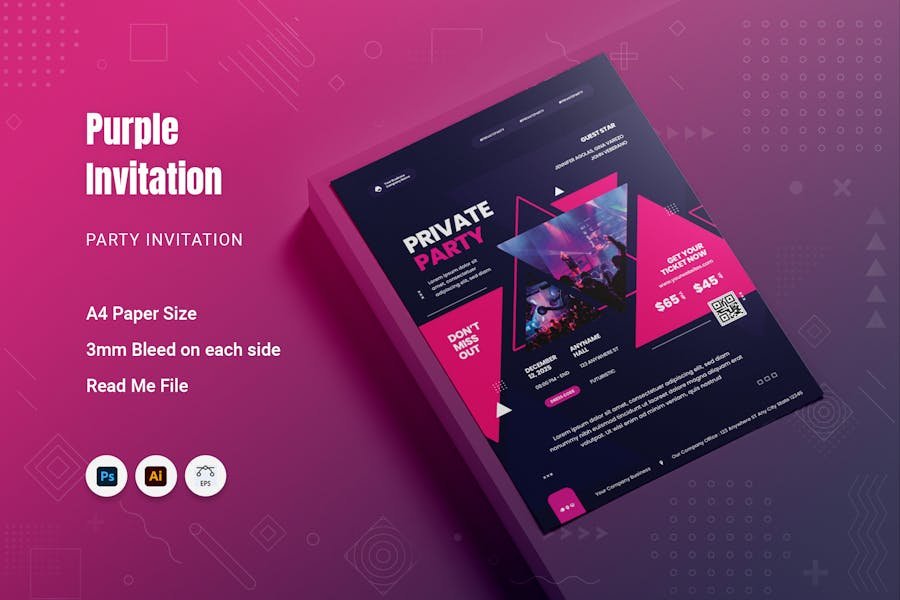 Purple Party Invitation Use our vibrant party card template to enhance your event! Prepare for a memorable and joyful celebration that will create cherished memories.