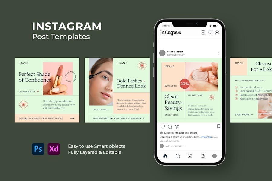 Skincare Social Media Template is a product designed to make your Creative Instagram posts look super elegant, stylish, and professional. This is a set of Instagram templates for Photoshop with beautiful graphics. Promote like a PRO and create your beautiful Instagram feed in no time. Features: